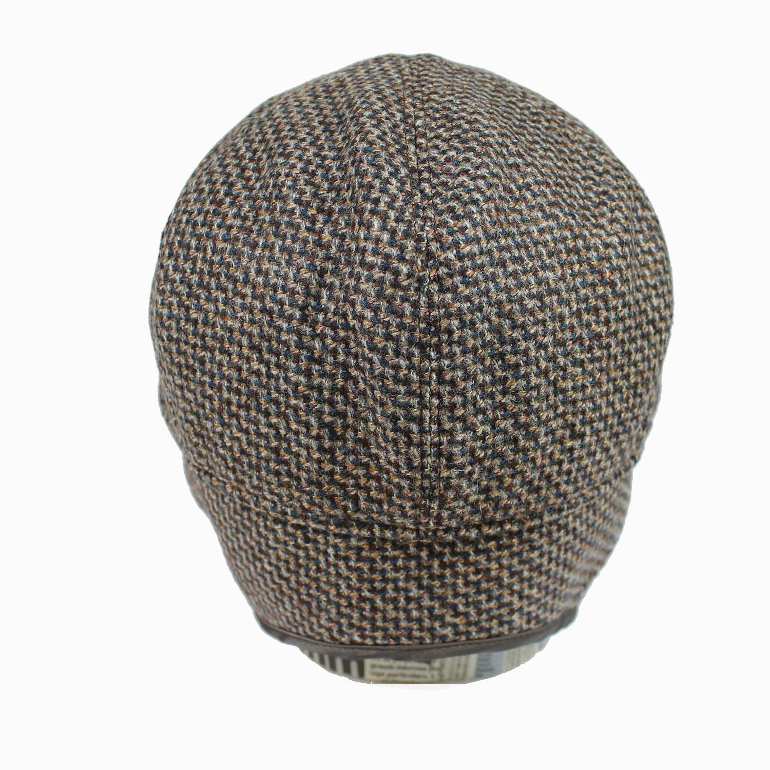 Cappello da uomo modello berretto a spicchi con paraorecchie interno. Coppola in tessuto lana e cashmere con una fantasia tweed tonalità marrone blu beige.