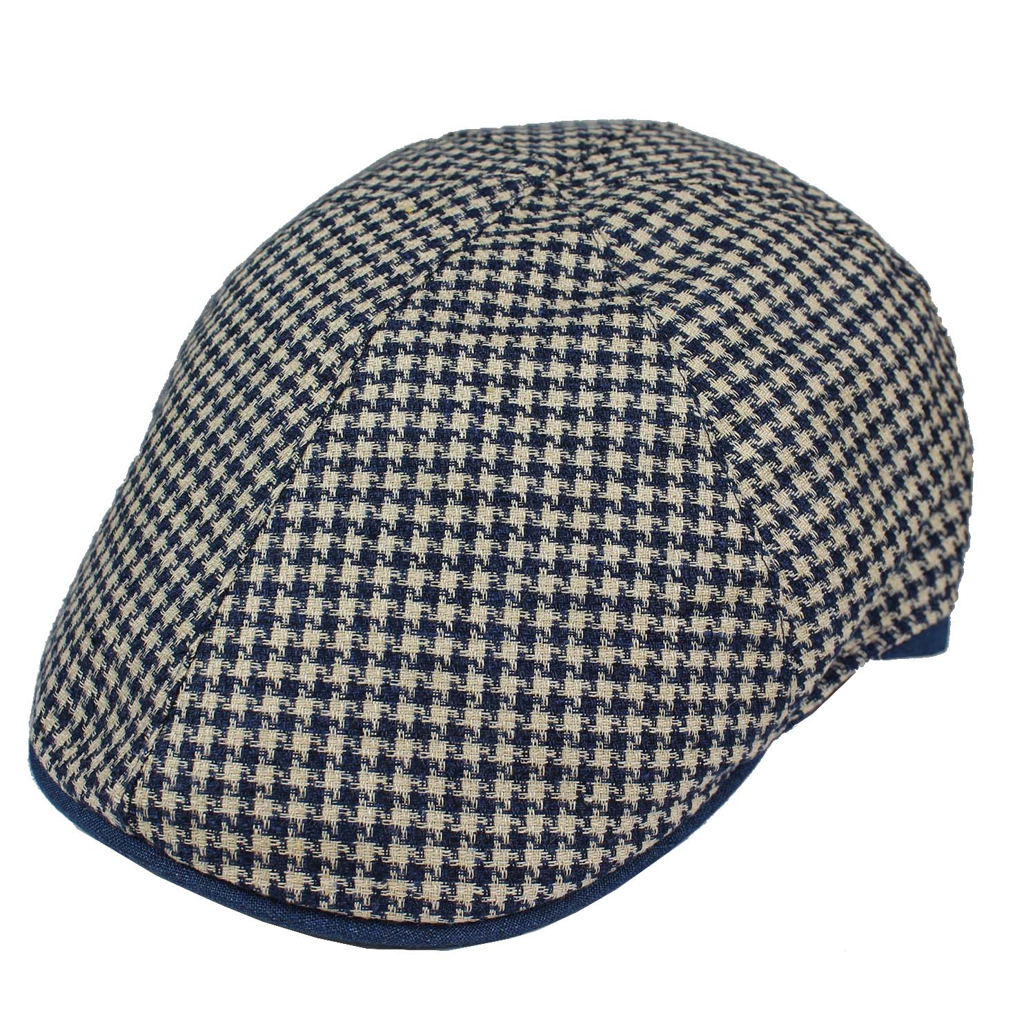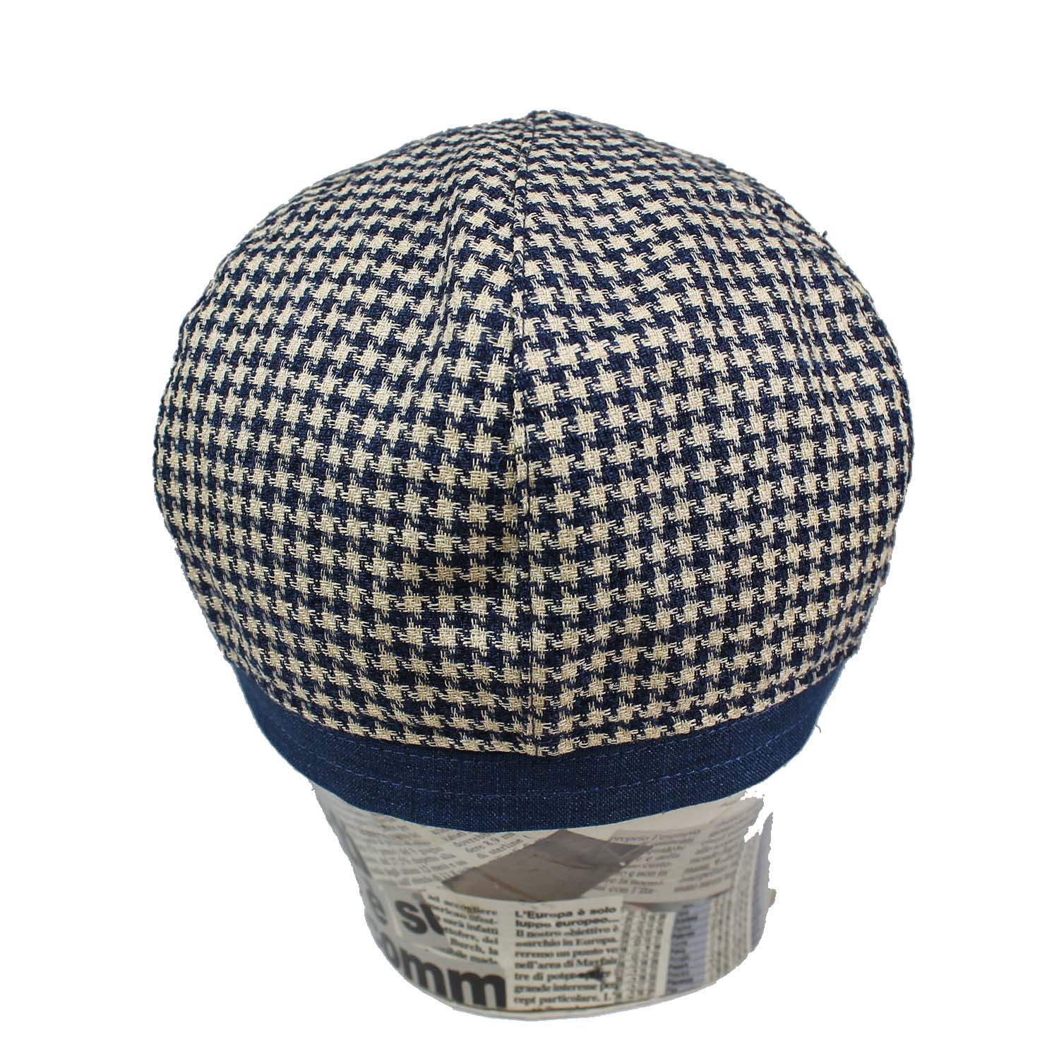 Cappello uomo estivo – Berretto a spicchi in lino e cotone fantasia pied de poule blu e panna